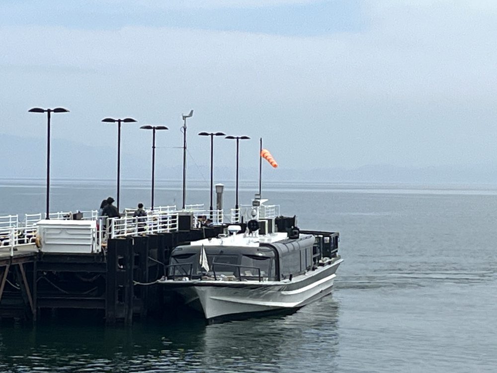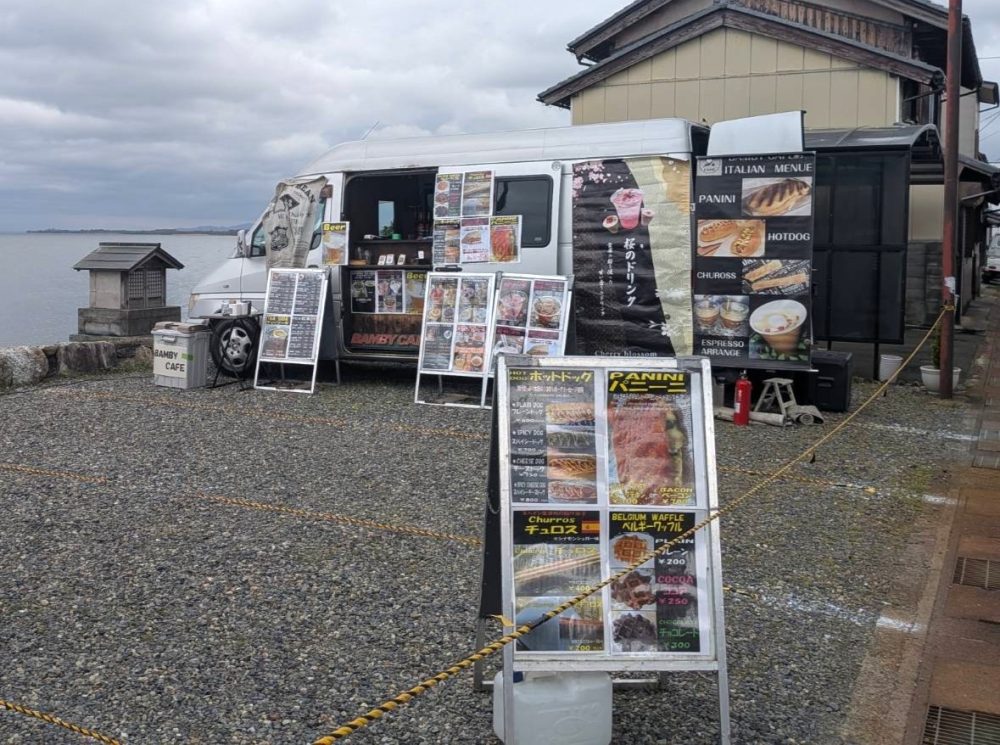 その絶景を湖上から楽しめる「海津大崎桜クルーズ」の発着港である今津港に、関西移動販売車組合からキッチンカーを派遣。春の行楽シーズン、多彩なキッチンカーグルメがさらに花を添えています。